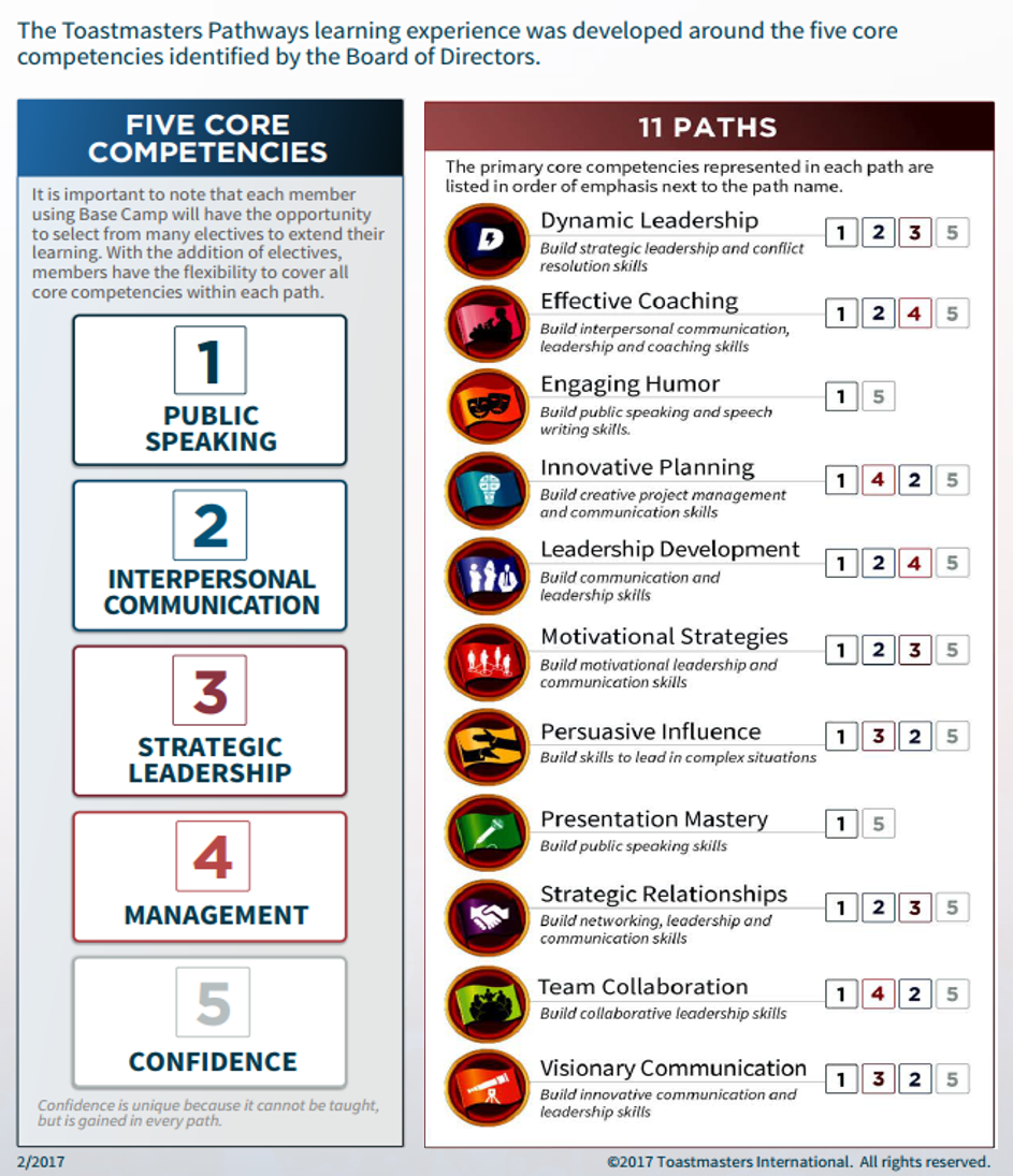Toastmasters Pathways will help you develop your skills in many different areas—communication, leadership, management, strategic planning, service to others, public speaking and more. Pathways sets you on your journey of personal and professional development. It offers many different avenues to explore and achieve. Pathways is a journey of possibilities.